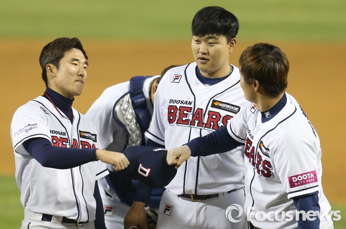 (서울=포커스뉴스) 8일 서울 잠실구장에서 열린 2016 프로야구 넥센-두산 경기에서 넥센에 6-4로 승리한 두산의 허경민(왼쪽)과 민병헌이 주먹을 마주치고 있다. 가운데는 오재일.