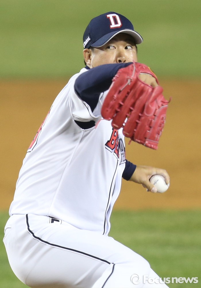 (서울=포커스뉴스) 8일 서울 잠실구장에서 열린 2016 프로야구 넥센-두산 경기에서 두산 마무리투수 이현승이 8회 1사 2루에서 구원 등판해 투구하고 있다.