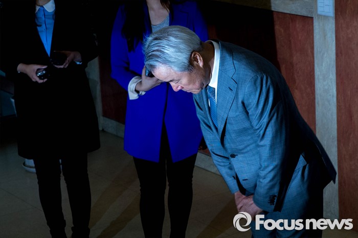 (서울=포커스뉴스) 정우현 MPK그룹 회장이 경찰 조사를 받기 위해 9일 오전 서울 서대문경찰서에 출석, 취재진 앞에서 고개 숙여 사과하고 있다. '미스터피자'를 운영하는 MPK 그룹의 정 회장은 지난 2일 서대문구의 한 건물 경비원 황모(58)씨의 뺨을 때린 혐의를 받고 있다.
