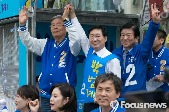 (대전=포커스뉴스) 9일 오후 대전 갤러리아백화점 타임월드점 앞에서 열린 더불어민주당 대전 서구 합동유세에 참석한 김종인(왼쪽부터) 비대위 대표 겸 선대위원장, 박범계 서구을, 박병석 서구갑 후보가 손을 들어 지지를 호소하고 있다.