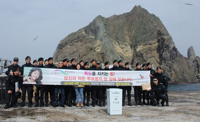 (서울=포커스뉴스) 9일 오전 경북 울릉군 독도에서 독도경비대원이 제20대 국회의원 선거 거소투표를 마친 뒤 기념촬영을 하고 있다. <사진제공=경북지방경찰청>