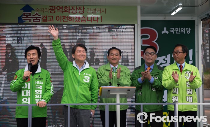 (수원=포커스뉴스) 9일 오후 수원시 장안구 수원종합운동장에서 열린 국민의당 합동유세에 참석한 안철수 대표가 시민들을 향해 인사를 건내고 있다.