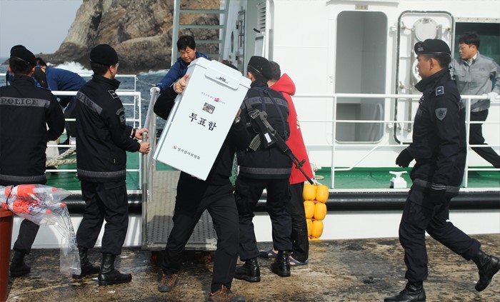 (서울=포커스뉴스) 9일 오전 경북 울릉군 독도에서 독도경비대원들이 제20대 국회의원 선거 거소투표를 하기 위해 투표함을 옮기고 있다. <사진제공=경북지방경찰청>