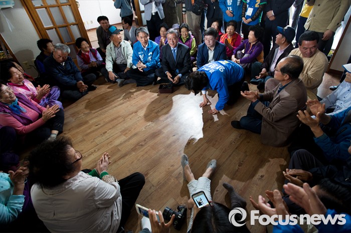 (광주=포커스뉴스) 양향자 더불어민주당 광주광역시 서구을 후보가 9일 오전 광주광역시 서구 발산마을회관에서 어르신들과 대화하던 중 큰절을 하고 있다.