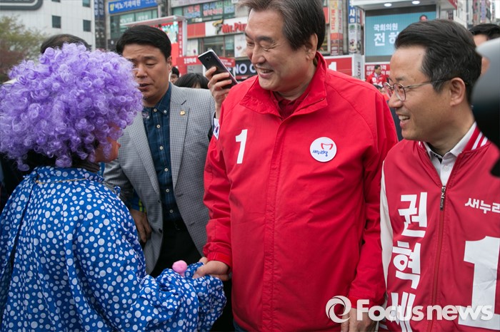(성남=포커스뉴스) 제20대 국회의원 선거를 나흘 앞둔 9일 오후 성남시 분당구 야탑역 광장에서 김무성(오른쪽 두번째) 새누리당 대표가 권혁세(오른쪽) 분당갑, 전하진 분당을 후보 지원유세를 마친 뒤, 선거운동원과 악수하고 있다.