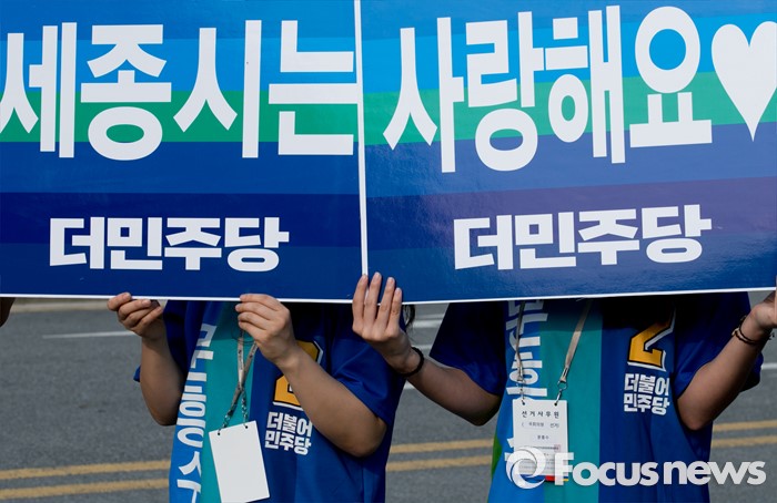 (세종=포커스뉴스) 9일 오후 세종시 국립세종도서관 앞에서 문흥수 더불어민주당 세종시 후보의 선거운동원들이 피켓을 들고 지지를 호소하고 있다.