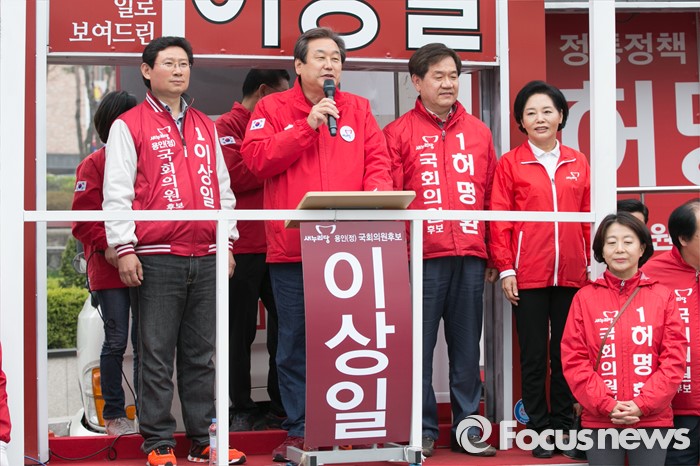 (용인=포커스뉴스) 제20대 국회의원 선거를 나흘 앞둔 9일 오후 경기도 용인시 기흥구 죽현마을 중앙공원에서 김무성(왼쪽 두번째) 새누리당 대표가 이상일(왼쪽) 용인정, 허명환(왼쪽 세번째) 용인을 후보 지원유세를 하고 있다.