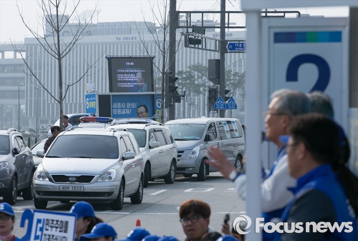 (세종=포커스뉴스) 9일 오후 세종시 국립세종도서관 앞에서 김종인 더불어민주당 비대위 대표 겸 선대위원장이 문흥수 세종시 후보의 지원유세를 하는 모습 너머로 이해찬 무소속 세종시 후보의 유세차량이 보이고 있다.
