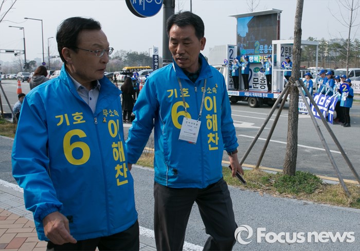 (세종=포커스뉴스) 9일 오후 세종시 국립세종도서관 앞에서 이해찬(왼쪽) 무소속 세종시 후보가 김종인 더불어민주당 비대위 대표 겸 선대위원장의 지원유세가 예정된 문흥수 세종시 후보의 유세장 앞을 지나고 있다.