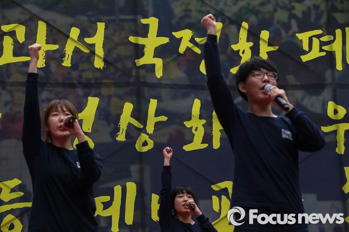 (서울=포커스뉴스) 9일 오후 서울 종로구 영풍문고 앞에서 '한국사 국정화 교과서 폐기 및 공교육 정상화를 위한 전국 초등예비교사 총궐기' 집회가 열리고 있다.