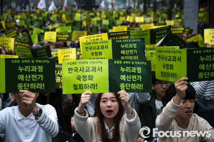 (서울=포커스뉴스) 9일 오후 서울 종로구 영풍문고 앞에서 '한국사 국정화 교과서 폐기 및 공교육 정상화를 위한 전국 초등예비교사 총궐기' 집회가 열리고 있다.