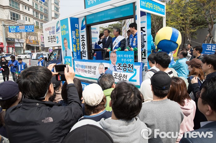 (남양주=포커스뉴스) 문재인 더불어민주당 전 대표가 10일 오전 경기도 이마트 남양주점 인근에서 조응천 더불어민주당 남양주갑 후보, 최민희 더불어민주당 남양주병 후보와 함께 유권자들에게 지지를 호소하고 있다.