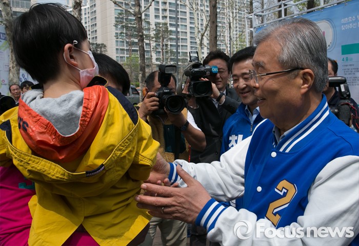 (서울=포커스뉴스) 김종인(오른쪽) 더불어민주당 비대위 대표 겸 선대위원장와 최명길 송파을 후보가 10일 오전 서울 석촌호수 서호 인근 거리에서 선거유세를 마친 뒤 나들이객들과 인사하며 지지를 호소하고 있다.