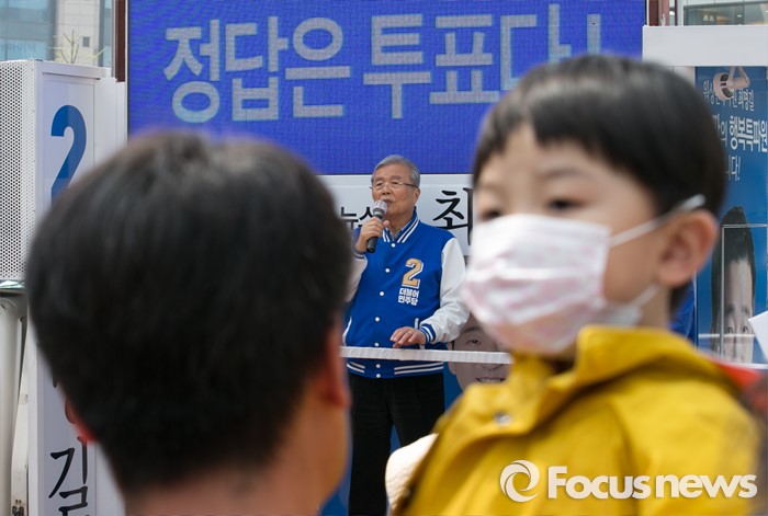 (서울=포커스뉴스) 김종인 더불어민주당 비대위 대표 겸 선대위원장이 10일 오전 서울 석촌호수 서호 인근 거리에서 최명길 송파을 후보의 지지를 호소하고 있다.