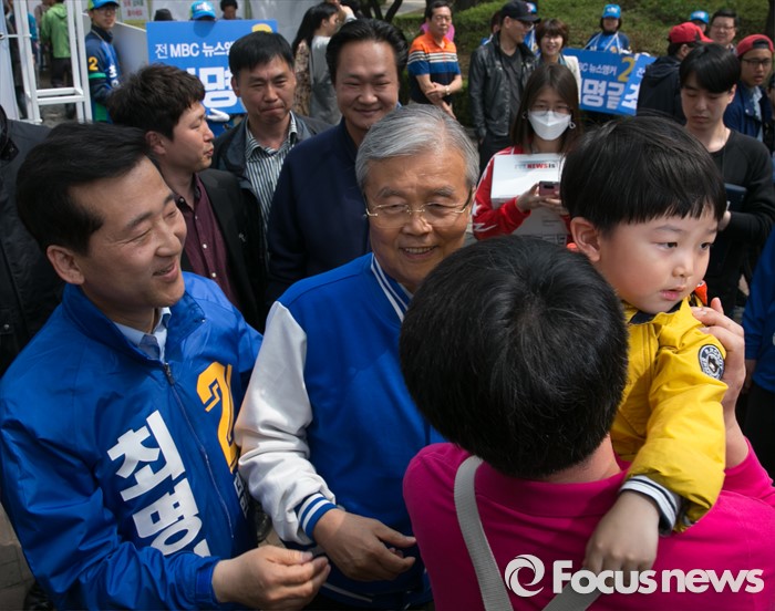 (서울=포커스뉴스) 김종인(가운데) 더불어민주당 비대위 대표 겸 선대위원장와 최명길(왼쪽) 송파을 후보가 10일 오전 서울 석촌호수 서호 인근 거리에서 선거유세를 마친 뒤 나들이객들과 인사하며 지지를 호소하고 있다.