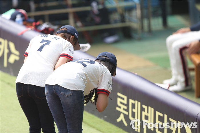 (서울=포커스뉴스) 10일 서울 잠실구장에서 열린 2016 프로야구 넥센-두산 경기에서 시구 및 시타로 나선 걸그룹 피에스타의 차오루와 혜미가 두산 덕아웃에 인사하고 있다.