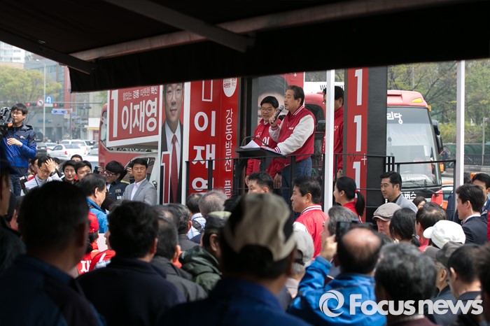 (서울=포커스뉴스) 김무성 새누리당 대표가 10일 오전 서울 강동구 양재대로 둔촌시장 앞에서 이재영 강동을 후보 지원유세를 하고 있다.