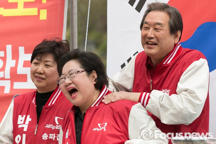 (서울=포커스뉴스) 김무성(오른쪽) 새누리당 대표가 10일 오전 서울 송파구 성내천 물빛광장에서 김을동(가운데) 송파병 지원유세 중, 김 후보의 어깨를 주무르고 있다.