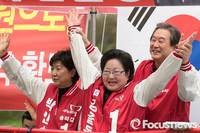 (서울=포커스뉴스) 김무성(오른쪽) 새누리당 대표가 10일 오전 서울 송파구 성내천 물빛광장에서 김을동(가운데) 송파병 지원유세를 하고 있다.