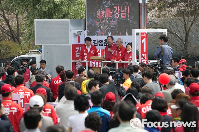 (서울=포커스뉴스) 김무성(왼쪽 두번째) 새누리당 대표가 10일 오후 서울 강남구 수서역 앞에서 이종구(왼쪽) 강남갑, 김종훈(오른쪽 두번째) 강남을, 이은재(오른쪽) 강남병 합동 지원유세를 하고 있다.