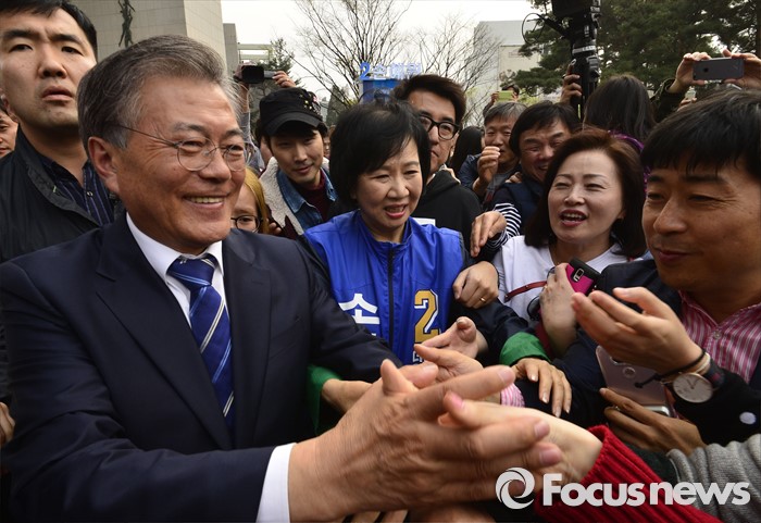 (서울=포커스뉴스) 문재인 더불어민주당 전 대표가 10일 오후 서울 마포구 홍익대학교 앞에서 손혜원 더불어민주당 마포을 후보의 지지를 호소하고 있다.