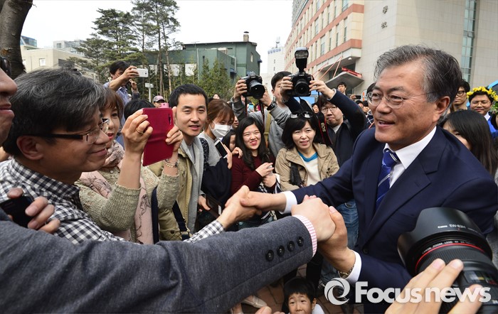 (서울=포커스뉴스) 문재인 더불어민주당 전 대표가 10일 오후 서울 마포구 홍익대학교 앞에서 손혜원 더불어민주당 마포을 후보의 지지를 호소하고 있다.