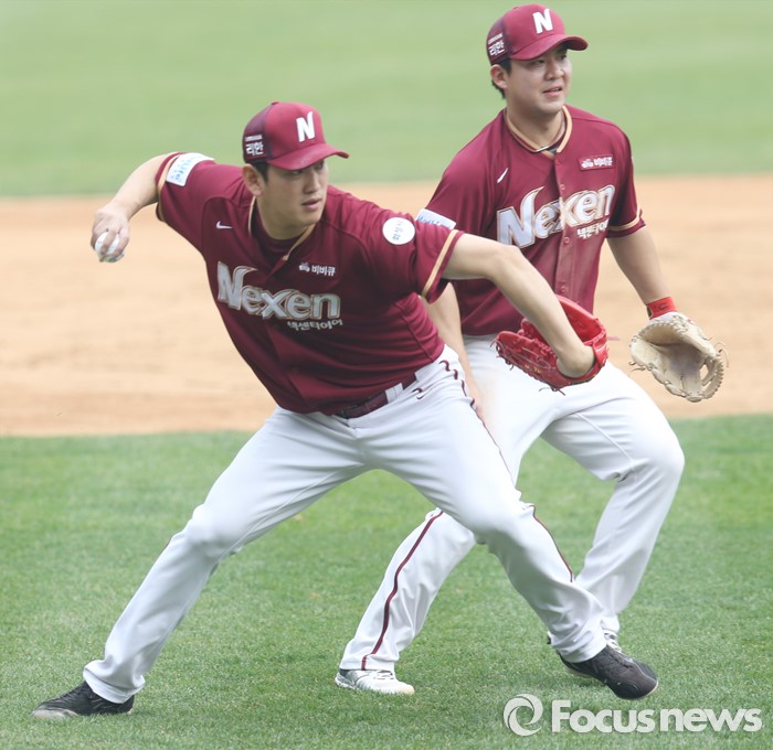 (서울=포커스뉴스) 10일 서울 잠실구장에서 열린 2016 프로야구 넥센-두산 경기 4회말 넥센 투수 양훈이 두산 오재원의 기습번트 타구를 잡아 1루로 송구하고 있다. 뒤는 3루수 김민성.
