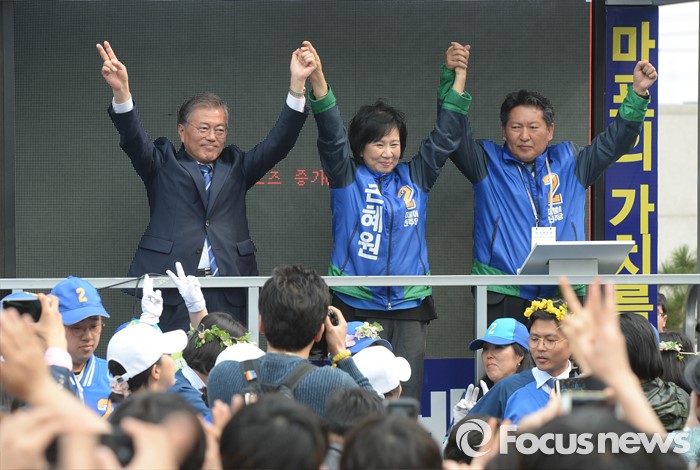 (서울=포커스뉴스) 문재인 더불어민주당 전 대표가 10일 오후 서울 마포구 홍익대학교 앞에서 손혜원 더불어민주당 마포을 후보의 지지를 호소하고 있다.
