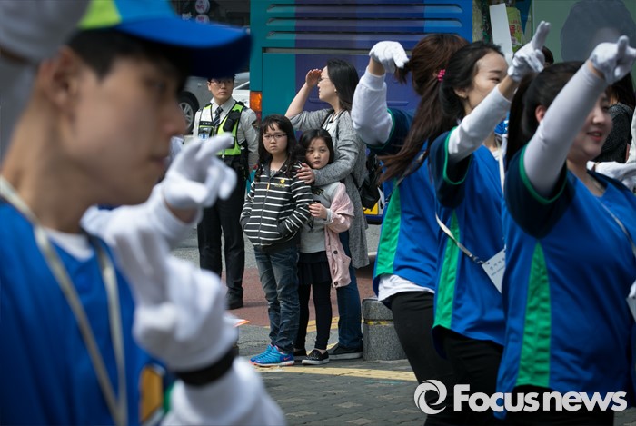 (성남=포커스뉴스) 10일 오후 경기도 성남 미금역 앞에서 더불어민주당 분당 합동유세에 어린이들이 선거운동원들의 율동 모습을 바라보고 있다.