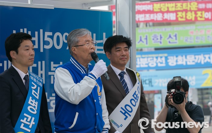 (성남=포커스뉴스) 10일 오후 경기도 성남 미금역 앞에서 열린 더불어민주당 분당 합동유세에 참석한 김종인(가운데) 비대위 대표 겸 선대위원장과 김병관(왼쪽) 분당갑, 김병욱 분당을 후보의 지지를 호소하고 있다.