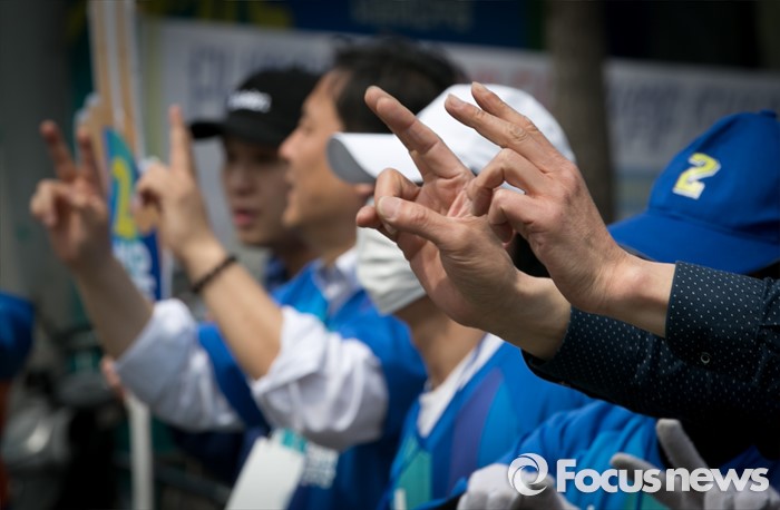 (성남=포커스뉴스) 10일 오후 경기도 성남 미금역 앞에서 더불어민주당 분당 합동유세에 참여한 선거운동원들이 지지를 호소하고 있다.