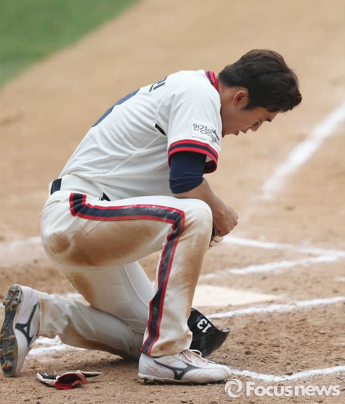 (서울=포커스뉴스) 10일 서울 잠실구장에서 열린 2016 프로야구 넥센-두산 경기 6회말 2사 2루에서 두산 정수빈의 좌전안타때 2루주자 허경민이 홈에서 태그아웃된후 무릎을 꿇고 아쉬워하고 있다.