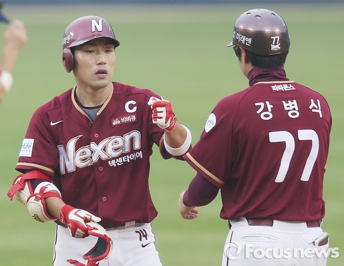 (서울=포커스뉴스) 10일 서울 잠실구장에서 열린 2016 프로야구 넥센-두산 경기 7회초 2사 1루에서 넥센 서건창이 우익수 옆으로 떨어지는 2루타를 치고 강병식 코치와 주먹을 마주치고 있다.