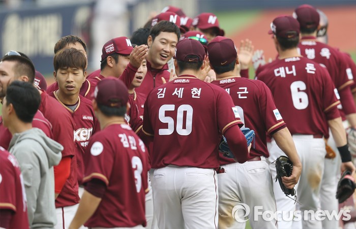 (서울=포커스뉴스) 10일 서울 잠실구장에서 열린 2016 프로야구 넥센-두산 경기에서 두산에 역전승한 넥센 선수들이 하이파이브를 하며 승리의 기쁨을 나누고 있다.