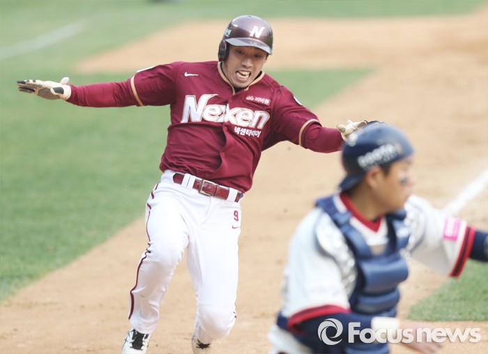 (서울=포커스뉴스) 10일 서울 잠실구장에서 열린 2016 프로야구 넥센-두산 경기 8회초 1사 만루에서 넥센 3루 대주자 박정음이 김하성의 우익수 희생플라이때 홈에서 슬라이딩하고 있다.
