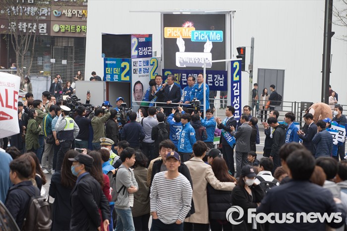 (서울=포커스뉴스) 10일 오후 서울 강남구 CGV 강남점 앞에서 이정근(왼쪽부터) 더불어민주당 서초갑 후보, 전원근 강남병 후보, 문재인 전 대표, 김성곤 강남갑 후보, 김기영 서초을 후보와 함께 유권자들에게 지지를 호소하고 있다.