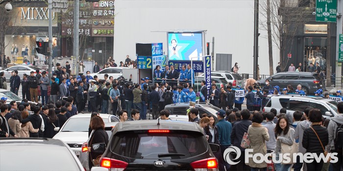 (서울=포커스뉴스) 10일 오후 서울 강남구 CGV 강남점 앞에서 이정근(왼쪽부터) 더불어민주당 서초갑 후보, 전원근 강남병 후보, 문재인 전 대표, 김성곤 강남갑 후보, 김기영 서초을 후보와 함께 유권자들에게 지지를 호소하고 있다.