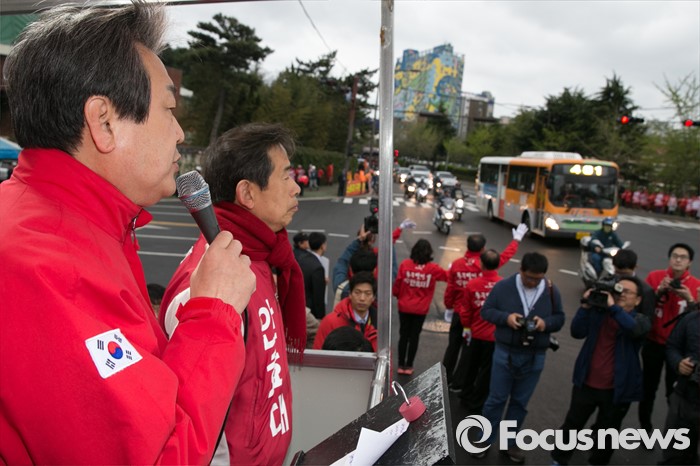 (울산=포커스뉴스) 김무성(왼쪽) 새누리당 대표가 11일 오전 울산시 동구 현대중공업 앞에서 안효대 울산 동구 후보 지원유세를 하고 있다.