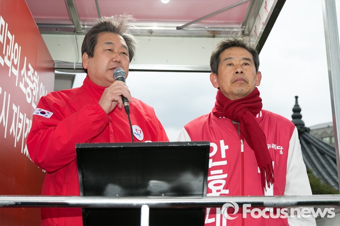 (울산=포커스뉴스) 김무성(왼쪽) 새누리당 대표가 11일 오전 울산시 동구 현대중공업 앞에서 안효대 울산 동구 후보 지원유세를 하고 있다.