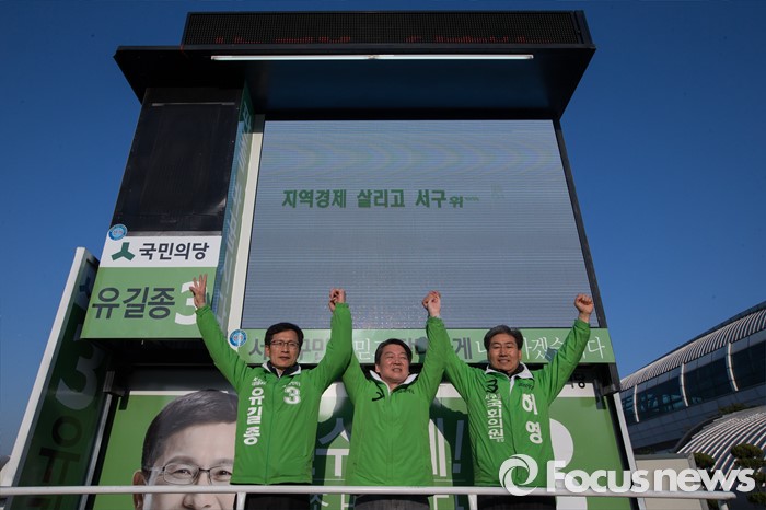 (인천=포커스뉴스) 안철수 국민의당 상임공동대표(가운데)와 인천 서구을 허영, 인천 서구갑 유길종 후보(왼쪽)가 11일 아침 인천시 서구 검암역에서 총선 승리를 다짐하고 있다.