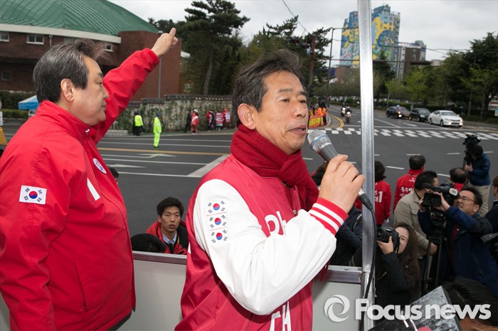 (울산=포커스뉴스) 김무성(왼쪽) 새누리당 대표가 11일 오전 울산시 동구 현대중공업 앞에서 안효대 울산 동구 후보 지원유세를 하고 있다.