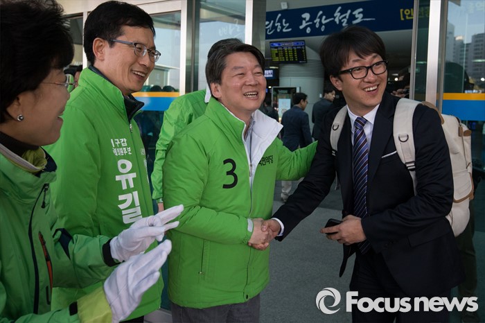 (인천=포커스뉴스) 안철수 국민의당 상임공동대표(가운데)가 인천 서구갑 유길종 후보와 11일 아침 인천시 서구 검암역에서 출근인사를 하고 있다.