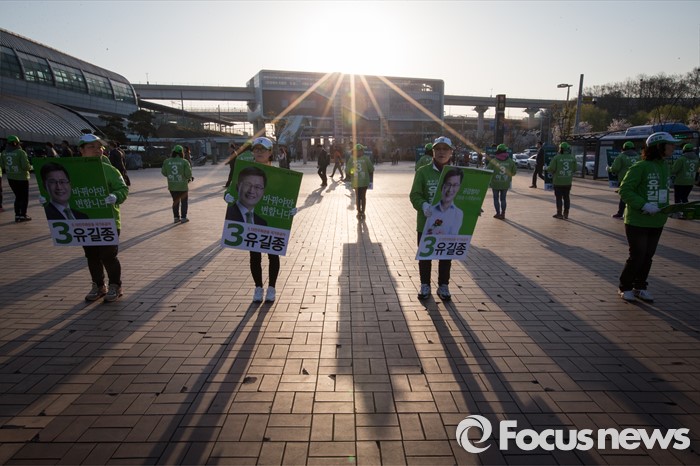 (인천=포커스뉴스) 국민의당 인천 서구갑 유길종 후보와 서구을 허영 캠프의 선거운동원들이 11일 아침 인천시 서구 검암역에서 국민의당 합동 출근인사를 하고 있다.