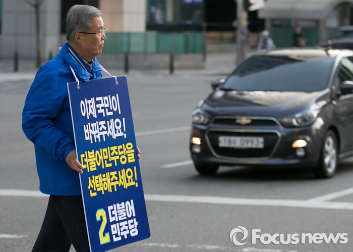 (서울=포커스뉴스) 20대 총선을 이틀 앞둔 11일 오전 서울 지하철 선릉역 인근 사거리에서 김종인 더불어민주당 비대위 대표 겸 선대위원장이 투표독려 캠페인을 하고 있다.