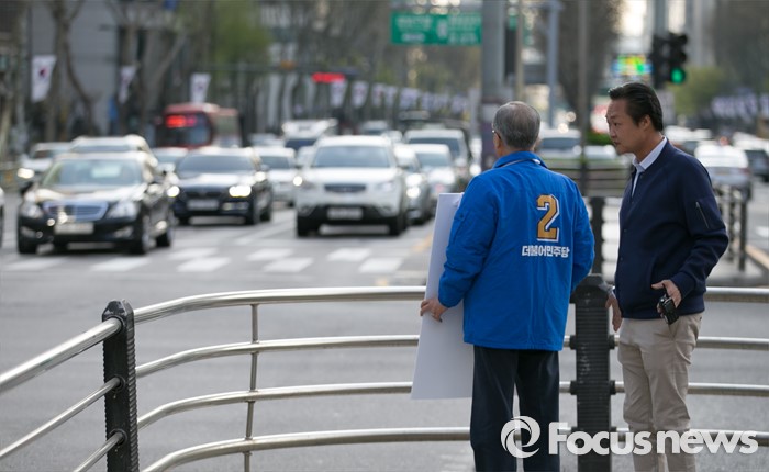 (서울=포커스뉴스) 20대 총선을 이틀 앞둔 11일 오전 서울 지하철 선릉역 인근 사거리에서 김종인 더불어민주당 비대위 대표 겸 선대위원장이 투표독려 캠페인을 하고 있다.