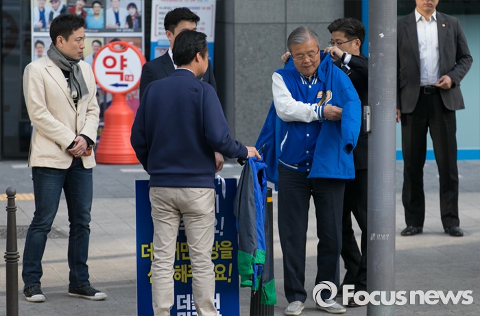 (서울=포커스뉴스) 20대 총선을 이틀 앞둔 11일 오전 서울 지하철 선릉역 인근 사거리에서 김종인 더불어민주당 비대위 대표 겸 선대위원장이 투표독려 캠페인을 준비하고 있다.