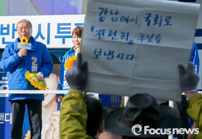 (서울=포커스뉴스) 20대 총선을 이틀 앞둔 11일 오전 서울 지하철 수서역 인근 거리에서 김종인(왼쪽) 더불어민주당 비대위 대표 겸 선대위원장과 전현희 강남을 후보가 지지를 호소하고 있다.