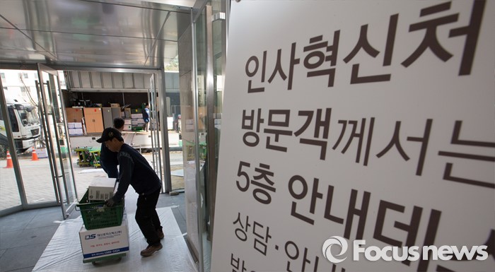 (세종=포커스뉴스) 세종시로 이전한 인사혁신처 직원들이 첫 출근한 11일 오전 세종시 절재로 인사혁신처에 집기류가 운반되고 있다.
