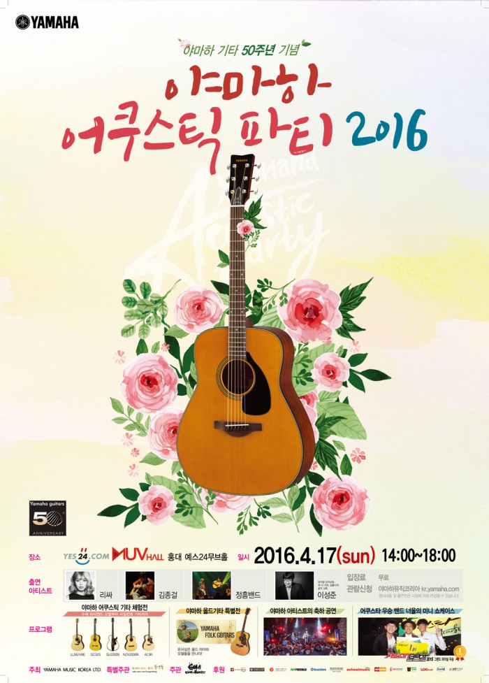 '야마하 어쿠스틱 파티 2016'은 다양한 기타를 전시·체험하고 공연도 즐길 수 있는 행사다. 오는 17일 서울 마포 홍대 예스24무브홀에서 오후 2시부터 6시까지 열리며, 야마하뮤직코리아 홈페이지를 통해 신청하면 무료로 관람할 수 있다.