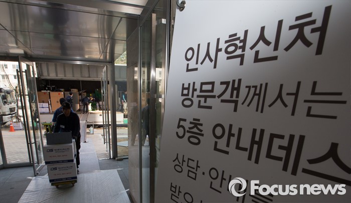 (세종=포커스뉴스) 세종시로 이전한 인사혁신처 직원들이 첫 출근한 11일 오전 세종시 절재로 인사혁신처에 집기류가 운반되고 있다.